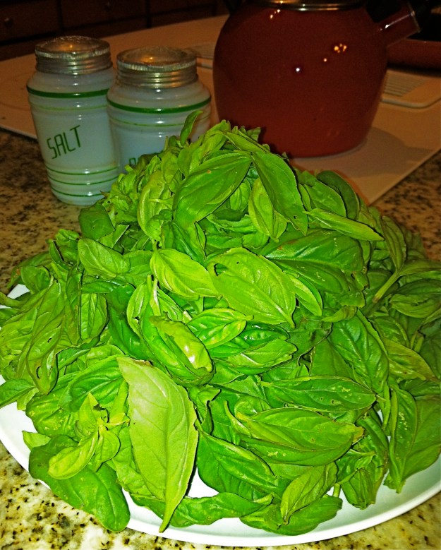 Basil Harvest :: It’s Saturday night and I’ve just brought my pink bucket that has housed my basil plant all summer indoors. Little plant, it is time to harvest you. It takes me an hour and one close encounter with a pincher bug to pluck all the basil leaves off my basil plant and several more hours of errands(picking up ingredients) plus a quick tutorial on how to operate the food processor before I am ready to pulverize my beloved basil into beautiful pesto.
